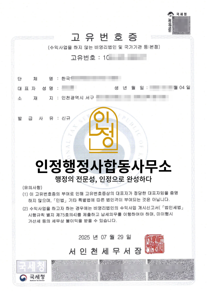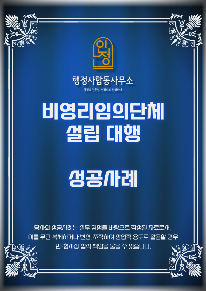 저희 인정행정사합동사무소는 고객과 함께 정관·규약을 작성하고, 회원명부와 사업계획서를 정비한 뒤, 관할 구청에 등록을 진행했습니다.