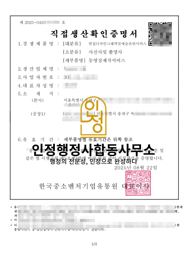 #직접생산확인증명서 #동영상제작서비스 #직접생산확인증명서발급 #직접생산확인증명서요건 #직접생산확인증명서절차 #조달청입찰자격 #전문행정사대행